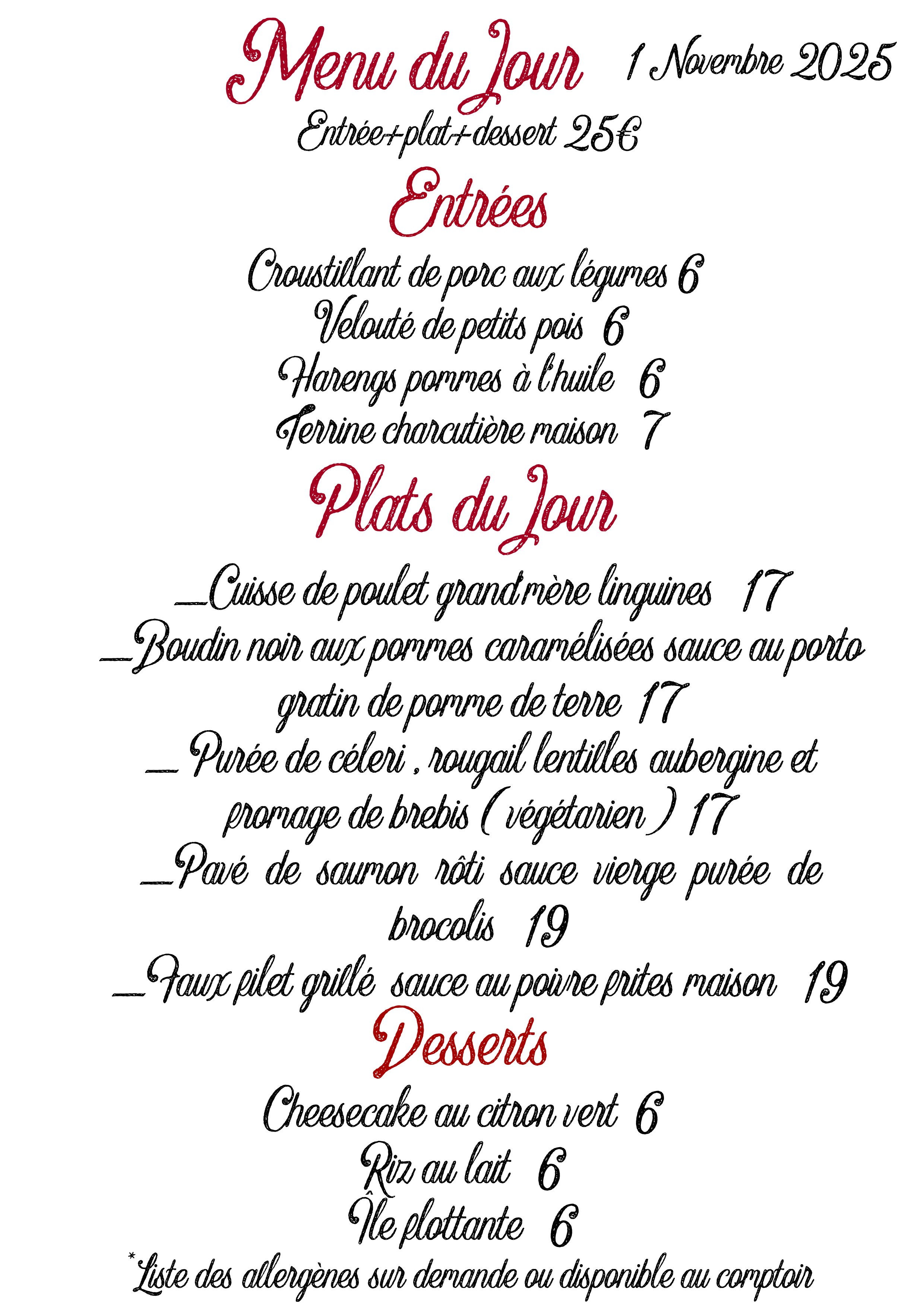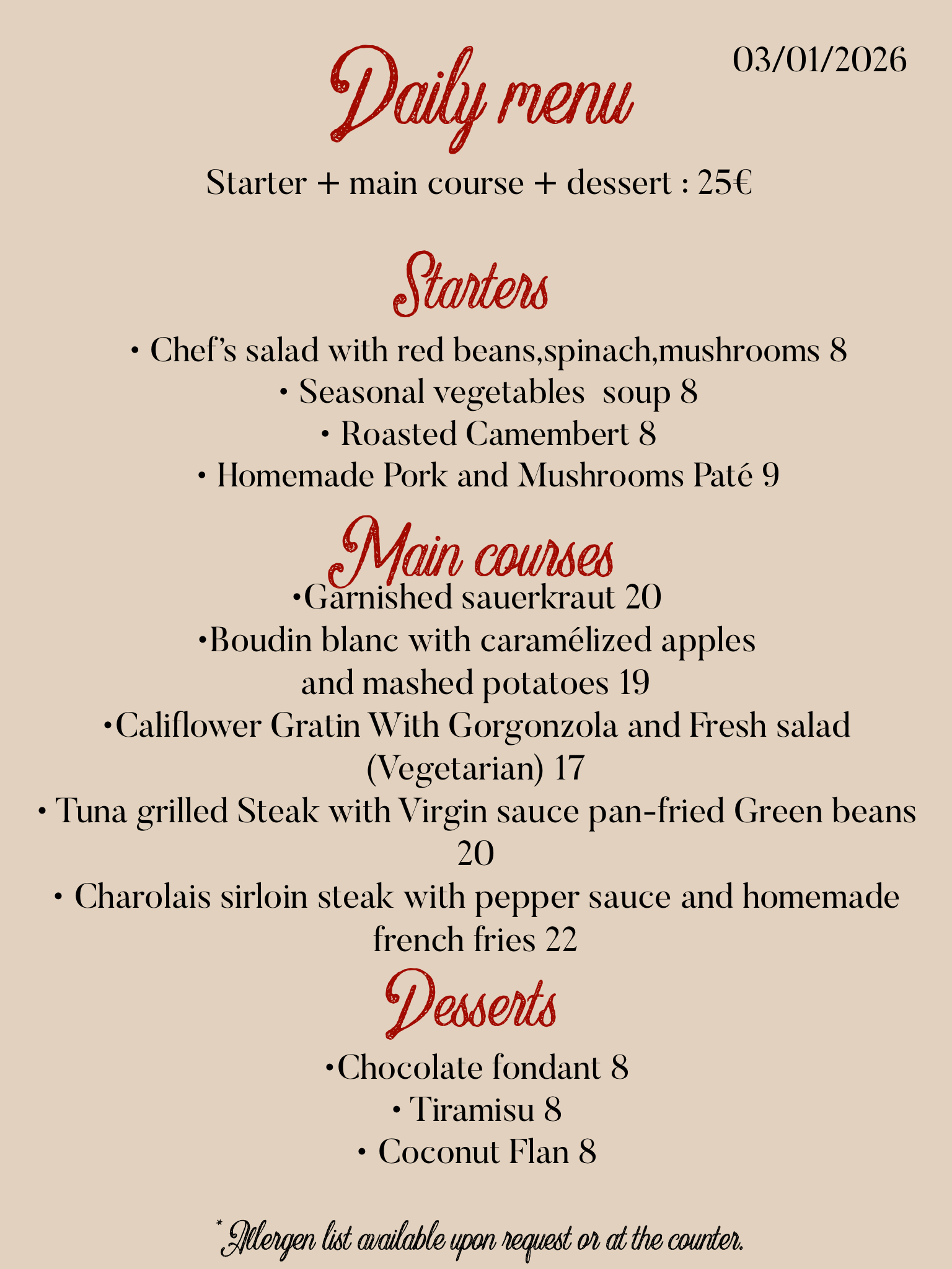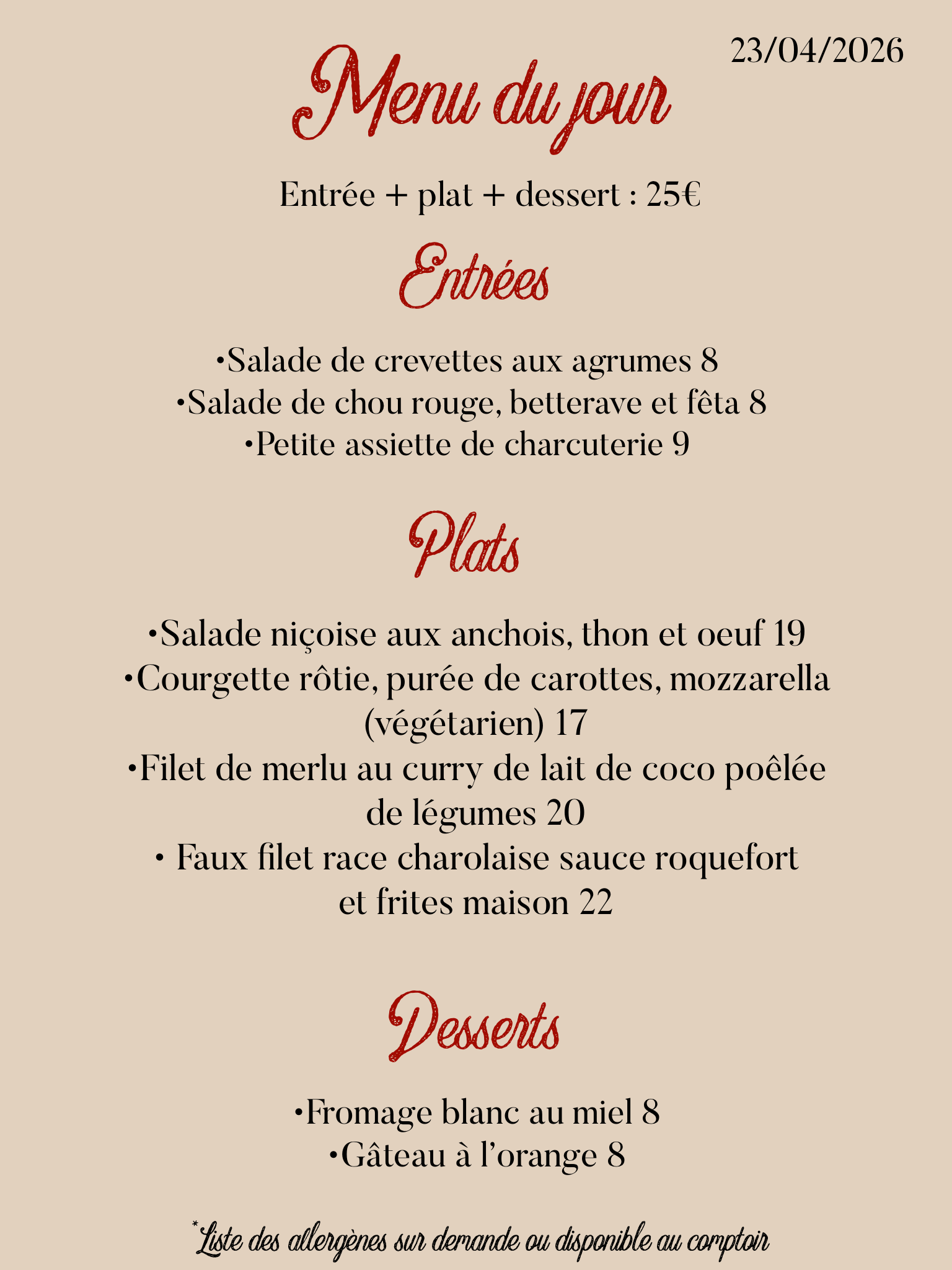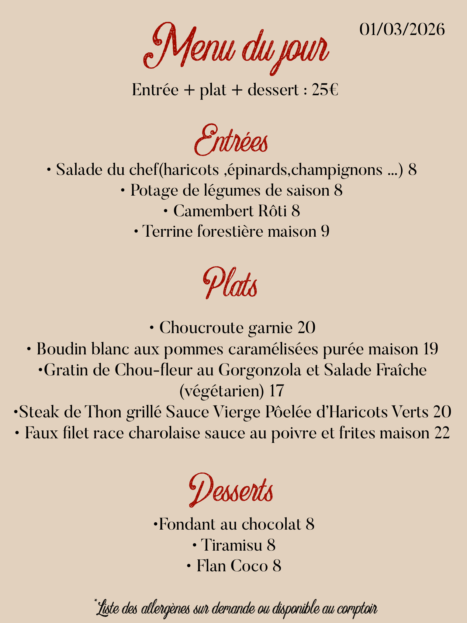 Notre cuisine, concoctée avec passion, met en valeur des plats faits maison, privilégiant les produits de saison. Venez déguster des mets délicieusement préparés dans une atmosphère détendue et familiale.