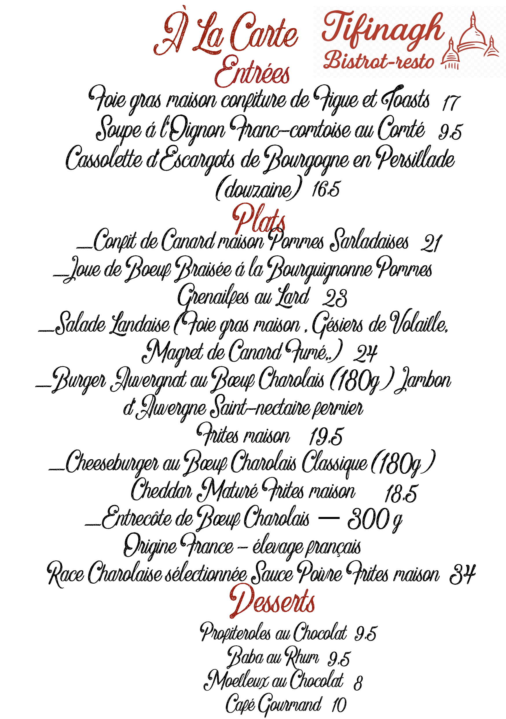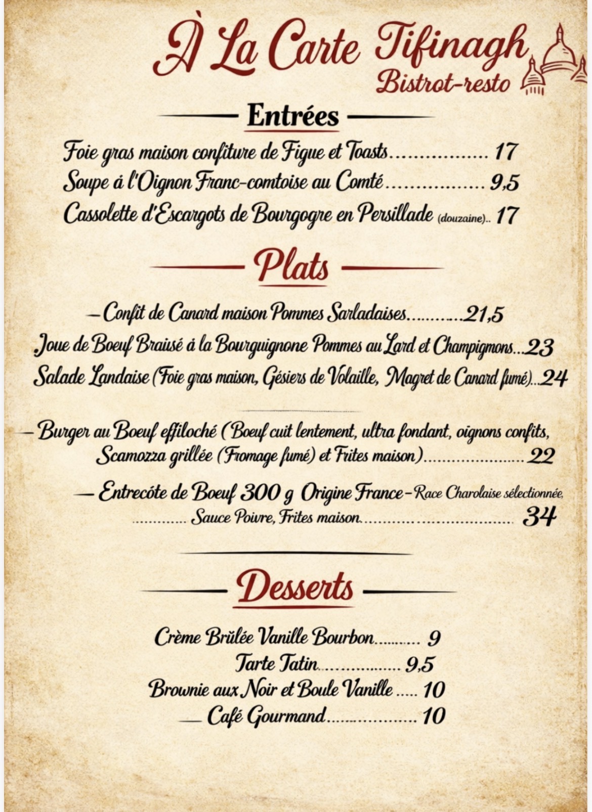 CALL +33142942240Loin de la foule et des cars de touristes du boulevard et de la place de Clichy, le restaurant le Tifinagh vous propose une cuisine familiale traditionnelle française simple et savoureuse dans un décor des années 30 et dans une ambiance chaleureuse pour vous retrouver entre amis !